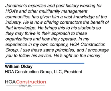 Now, as a published author, public speaker (trained under Les Brown), and marketing strategist for home service pros nationwide, Jonathan teaches contractors how to use his MNO System to scale into commercial with professionally managed properties like HOA/COA work, the right way.